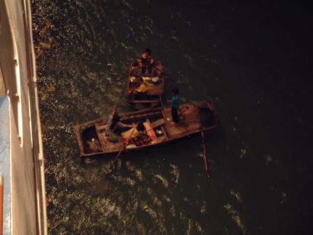 As soon as we have anchored, around 9-10 AM, local tour boats start to show up, and tie up alongside our ship’s side. This so we can start as soon as possible to get our dear passengers off so they can get on their way on their planned excursions. This particular operation is a little “nightmarish” because it is all before a deadline, and hardly anyone speaks a word English, and none of us speak Vietnamese. So we are again very dependent upon some of our local agents to get this run smoothly.