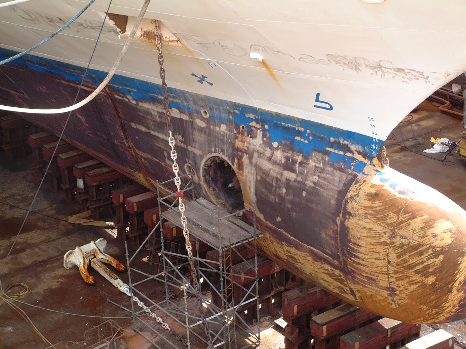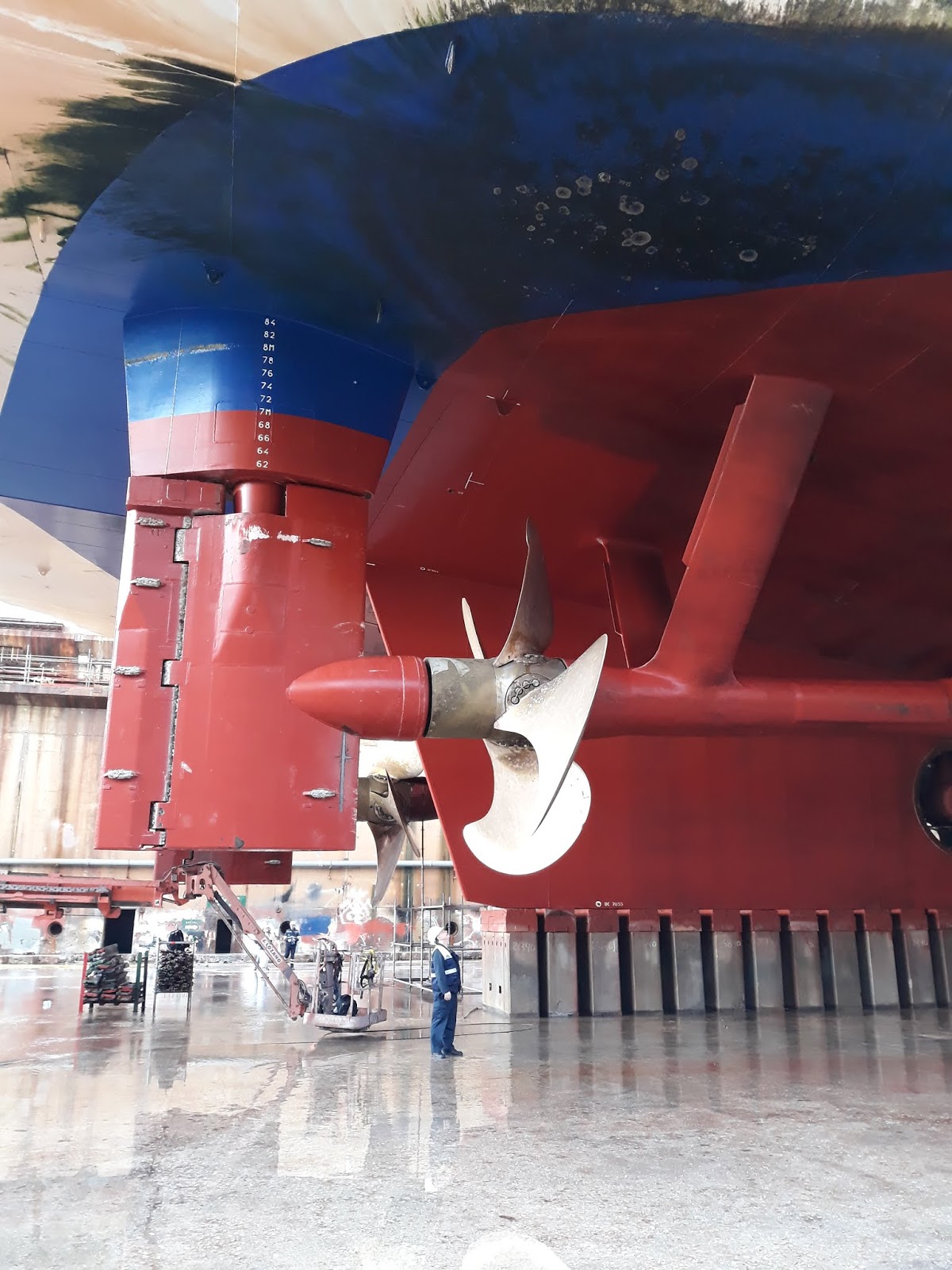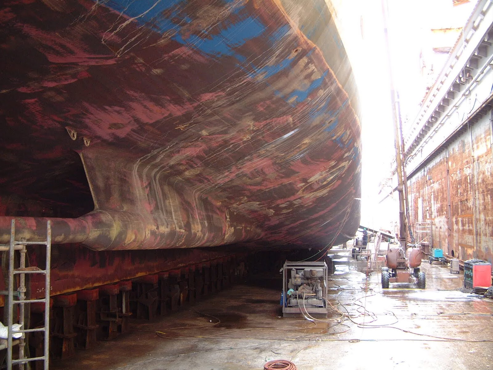 When the ship arrives the yard and the Dry Docking area, some specialists from the yard will come onboard to assist us with pulling the ship (by several tugboats) in to the Dry Dock. This needs to be done perfectly and without any engine power (or propellers moving) because the yard people have already placed “blocks” in the Dock bottom based upon the ship’s design (shape, length, draft, etc), which the ship will finally sit on when all the water has been pumped out of the Dry Dock. This operation takes several hours and is painstaking slow. No room for any mistakes when this is done. So when the ship is in position, and a diver is under the ship inside the Dock, the Dock door will be closed and the water pumped out. The ship has a couple of mooring lines connected to the sides of the dock, which we use to adjust the ship based upon the diver and the Dock Master (the one in charge of that particular operation).