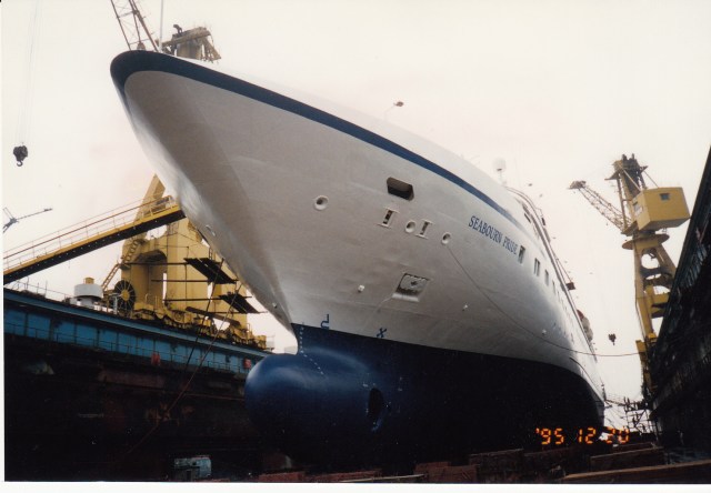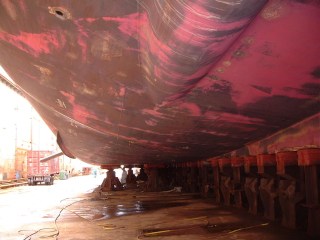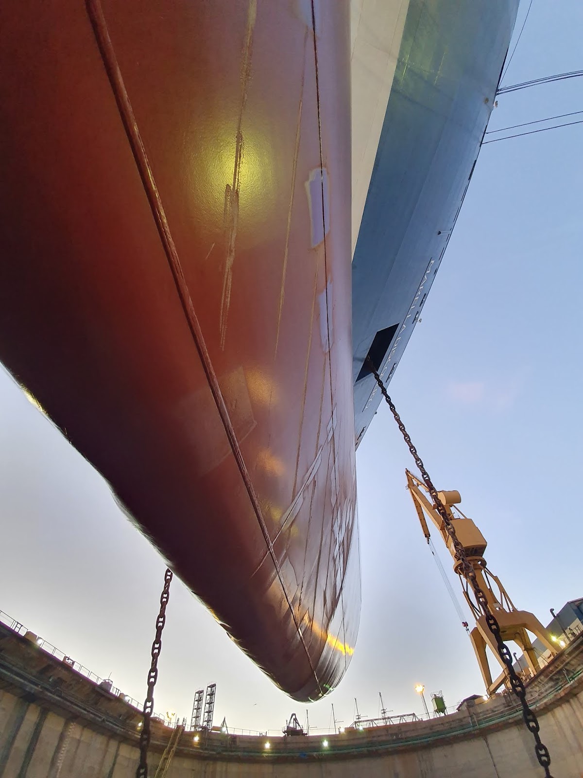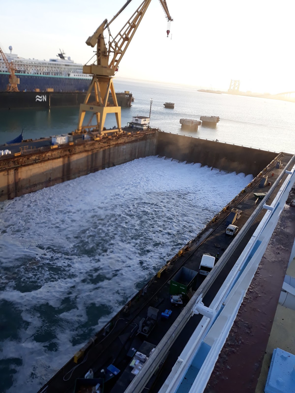 When the ship arrives the yard and the Dry Docking area, some specialists from the yard will come onboard to assist us with pulling the ship (by several tugboats) in to the Dry Dock. This needs to be done perfectly and without any engine power (or propellers moving) because the yard people have already placed “blocks” in the Dock bottom based upon the ship’s design (shape, length, draft, etc), which the ship will finally sit on when all the water has been pumped out of the Dry Dock. This operation takes several hours and is painstaking slow. No room for any mistakes when this is done. So when the ship is in position, and a diver is under the ship inside the Dock, the Dock door will be closed and the water pumped out. The ship has a couple of mooring lines connected to the sides of the dock, which we use to adjust the ship based upon the diver and the Dock Master (the one in charge of that particular operation).