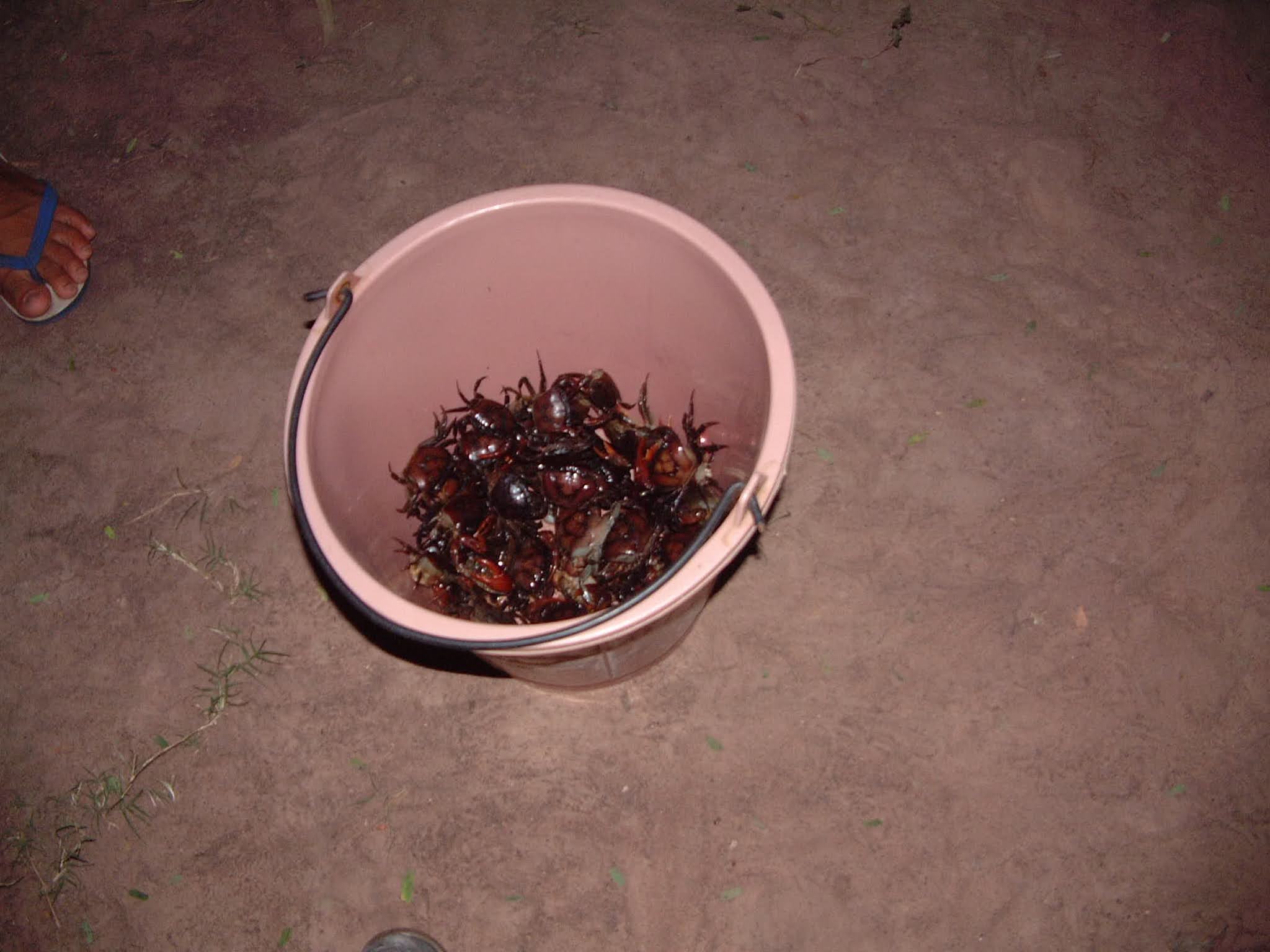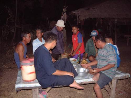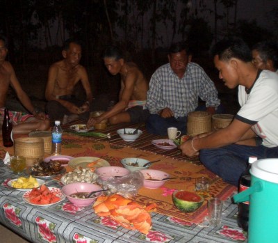 And just like in the village, food and beverages will be prepared for everyone to share. This time the food will be a real meal (dinner time), not only snacks. Plenty of local food I never saw or smelled before, and of course the grilled chicken, cooked chicken, grilled fish, soups, steamed rice, sticky rice, wok grilled beef bits and pork bits with their dipping sauces, and not to forget…….the insects! Oh yes, the insects. Most of us remember the insects. Roasted silk works, grasshoppers, and baby frogs. Then some soft water beetles they suck the juices and eggs out of. And the ant eggs of course. A culinary voyage you never forget. π