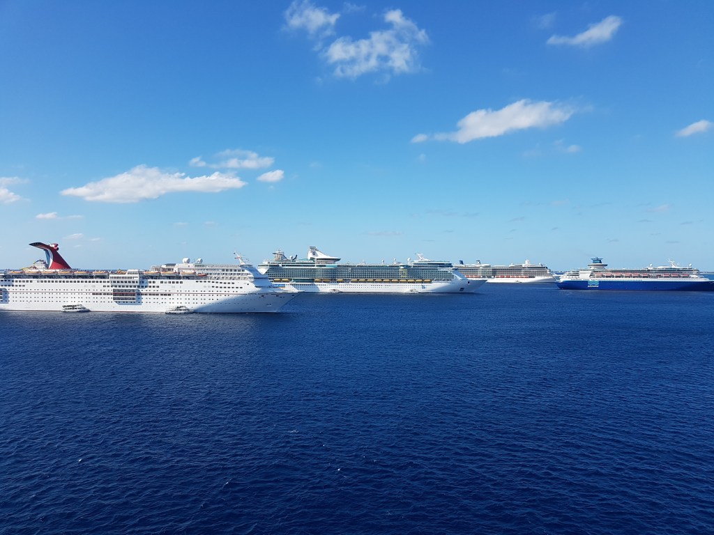 Sometimes when we are visiting an island and we all (cruise ships) must anchor off the port, it can become very crowded. When we were at anchor off Grand Cayman island, in the Western Caribbean, we could sometimes be 5-6 ships there at the same time. This means approximately 15 000 passengers and 5-6000 Crew members had to be shuttled back and forth with boats.