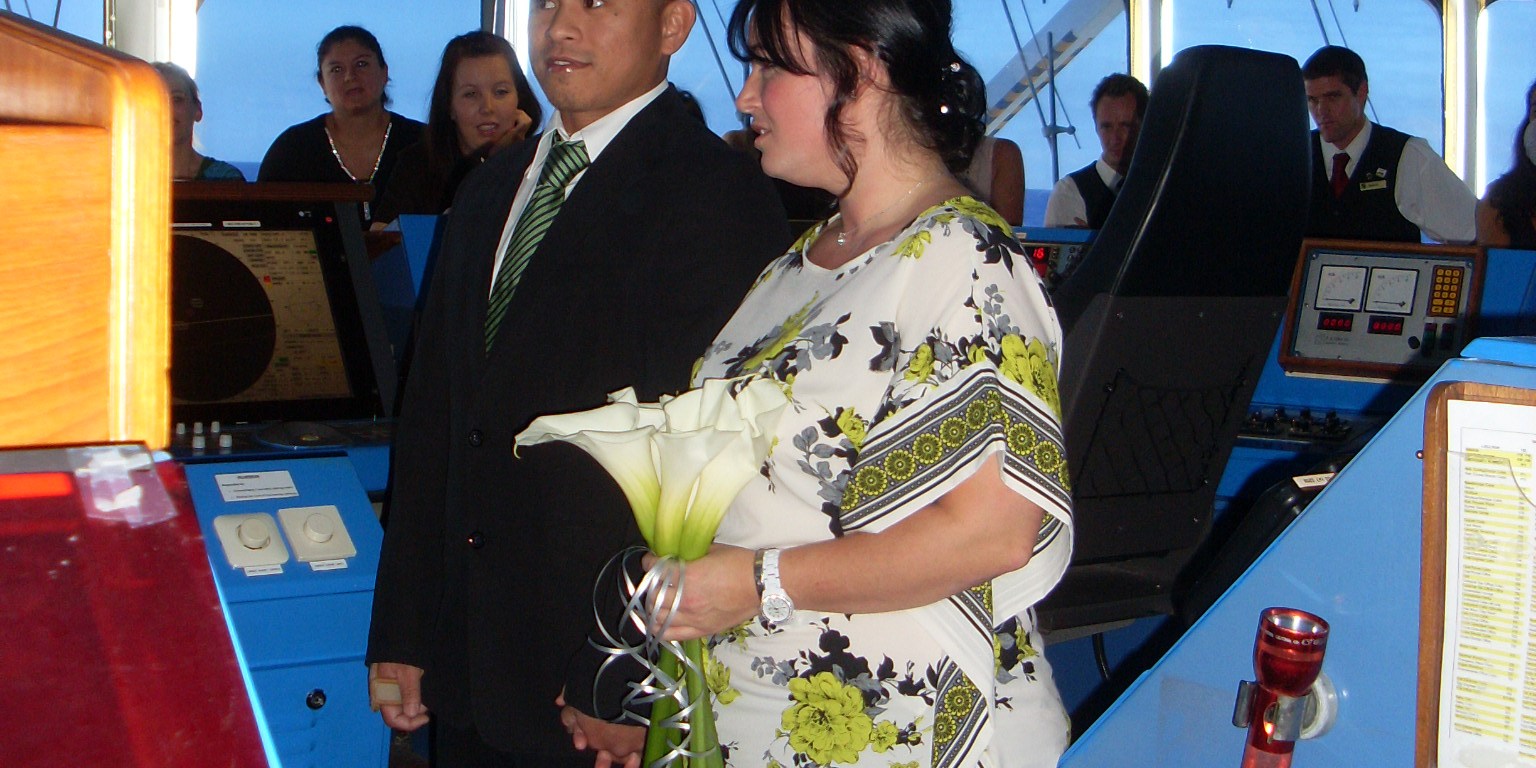 The ship’s passengers will normally buy a kind of a wedding package onboard. This package will include the ceremony, normally on the bridge, a short cocktail party with some of the Officers, then a very nice, long dinner together with the Captain or Staff Captain later in the evening. Ending with a show in the lounge.